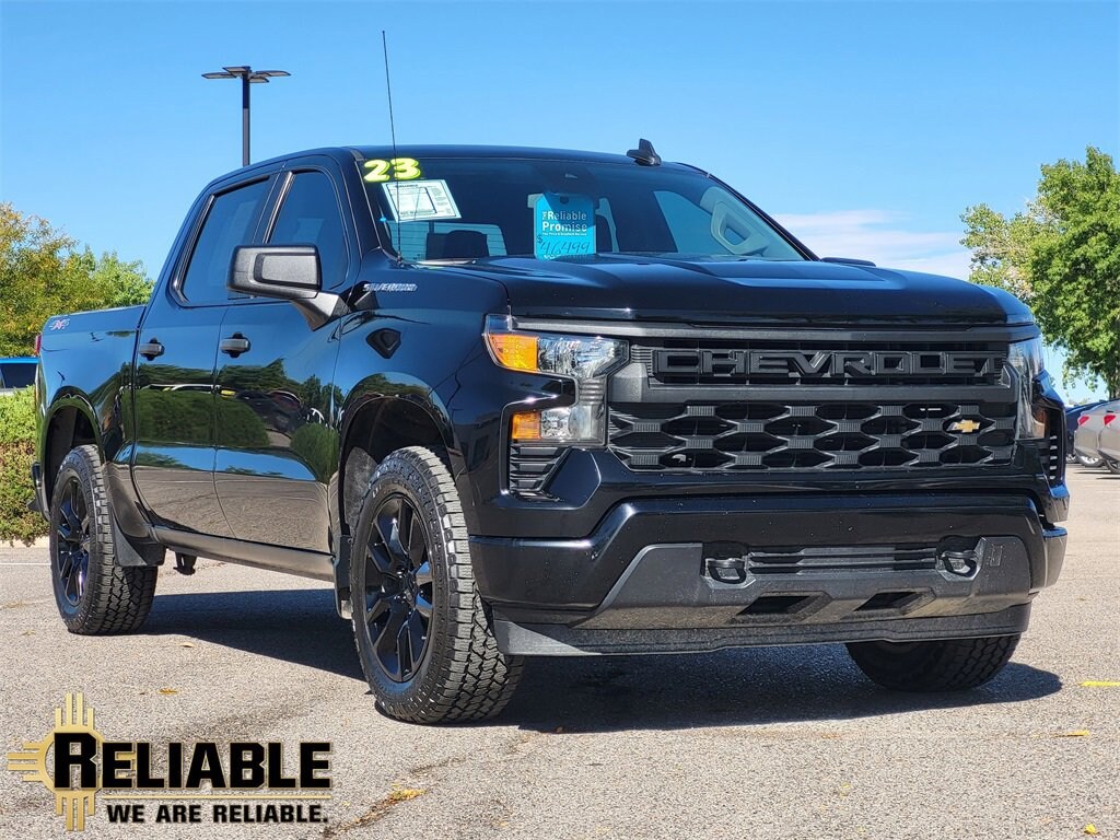 Comfortably in command, our Accident Free, One Owner 2023 Chevrolet Silverado 1500 Custom Crew Cab Short Bed 4X4 captures your attention in Black! Motivated by a 2.7L Turbo supplying 310hp connected to an 8 Speed Automatic transmission with tow/haul mode. A high-capacity suspension enhances capability further, and this Four Wheel Drive truck returns nearly 21mpg on the highway. Our Silverado's rugged good looks help get you noticed with a powerful grille, LED lighting, bed lighting, 20-inch alloy wheels, black recovery hooks, a CornerStep rear bumper, an EZ Lift power lock/release tailgate, heated power mirrors, and a trailer hitch.Our Custom cabin is well-equipped for busy days with supportive cloth seats, 10-way power for the driver, a tilt-adjustable steering wheel, single-zone climate control, cruise control, 12V/120V power outlets, keyless access/ignition, and remote start. A 7-inch touchscreen, WiFi compatibility, Android Auto, Apple CarPlay, Bluetooth, and a six-speaker sound system are onboard for quick connections and your favorite soundtrack. Added convenience comes with our Silverado's smart storage solutions.For safety's sake, Chevrolet has your back with automatic braking, an HD rearview camera, lane-keeping assistance, forward collision warning, a rear-seat reminder, and more. Now check out our Silverado Custom for yourself and take charge of your world! Save this Page and Call for Availability. We Know You Will Enjoy Your Reliable Chevrolet Test Drive Towards Ownership!www.reliable-chevrolet.com , Excellent selection of New and Used, Cars, Trucks, Vans, SUV, Financing Options. Reliable Chevrolet is an award-winning dealership located within Albuquerque, NM. We pride ourselves on our exceptional customer service and do what's needed to ensure our customers are always satisfied with their car-buying experience. Founded in 1987, our facility was one of the first dealerships to open up on the west side of Albuquerque, and because of this, we have become a valued member of the community and a trusted automotive dealer. With an excellent selection of top-notch new Chevy cars for sale, along with great used Chevy cars for sale that maintain outstanding quality, Reliable Chevy is a first-class dealership you and your family can count on.
