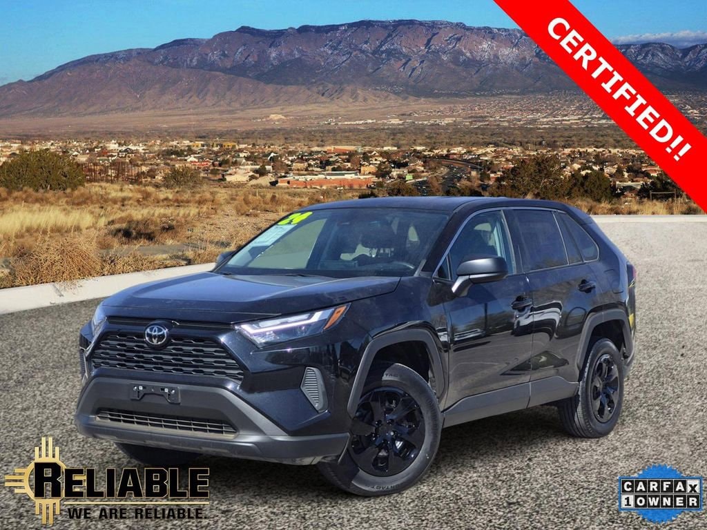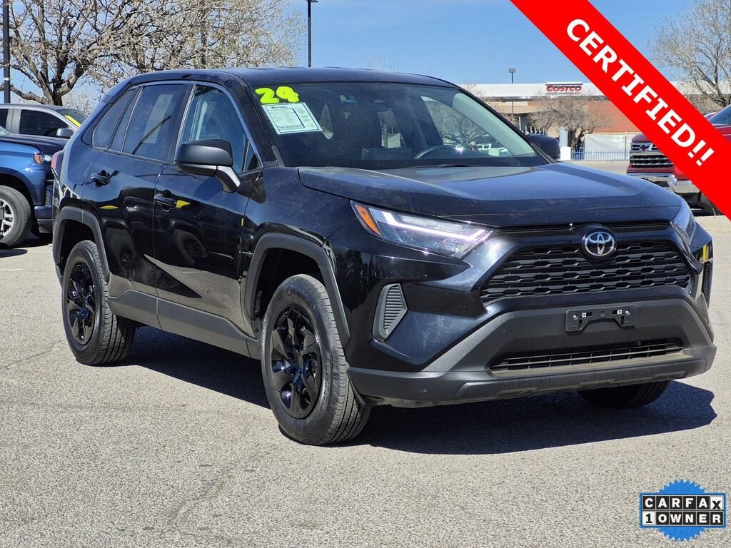Add some driving pleasure to your day with our One Owner, Miles Below Market Average 2024 Toyota RAV4 LE AWD shown in Midnight Black Metallic! Motivated by a 2.5 Liter Dynamic Force 4 Cylinder offering 203hp to an 8 Speed Automatic transmission enhanced by Multi-Terrain Select. Enjoy athletic capability with Agile Cornering Assist, and you can also look forward to scoring nearly 33mpg on the highway in this All Wheel Drive SUV. Our RAV4 radiates fierce functionality with LED lighting, 17-inch wheels, black bumper accents, matching overfenders/mirrors, a built-in rear spoiler, and dual chrome exhaust outlets.